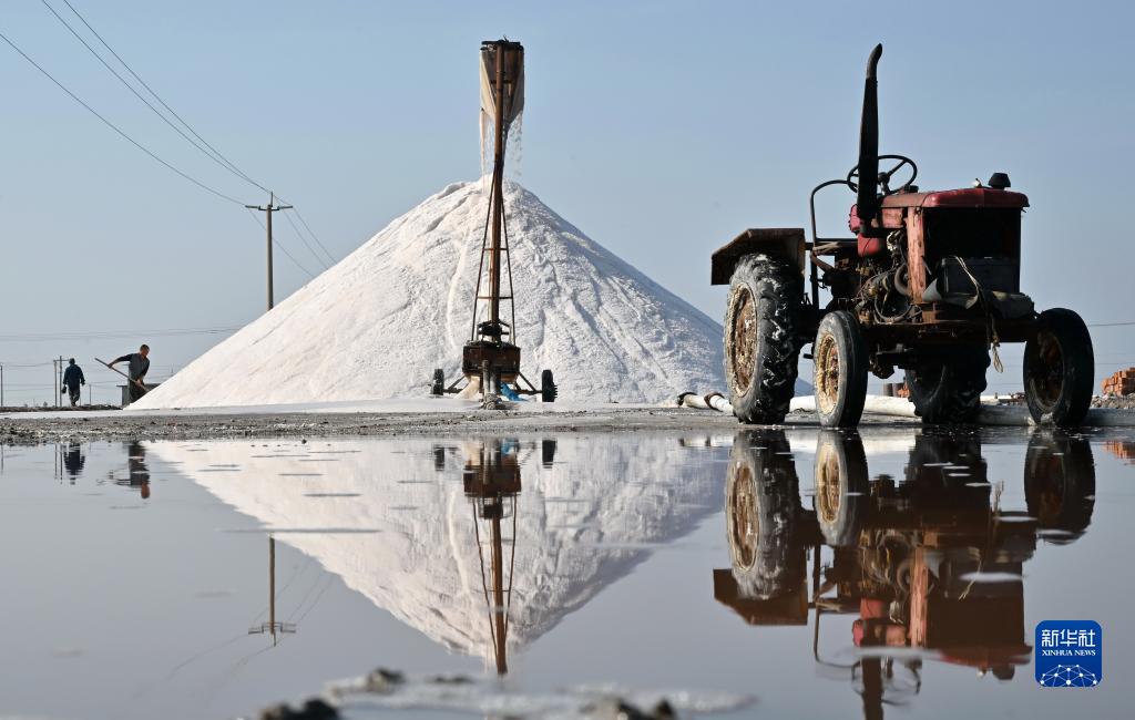 10月14日,工人在河北省灤南縣嘴東經(jīng)濟開(kāi)發(fā)區鹽場(chǎng)收獲秋鹽。