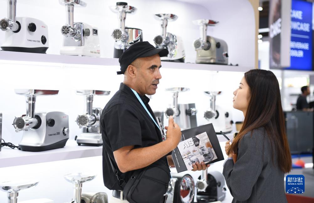 10月15日,一名外國采購商在一家小家電展臺洽談業(yè)務(wù)。