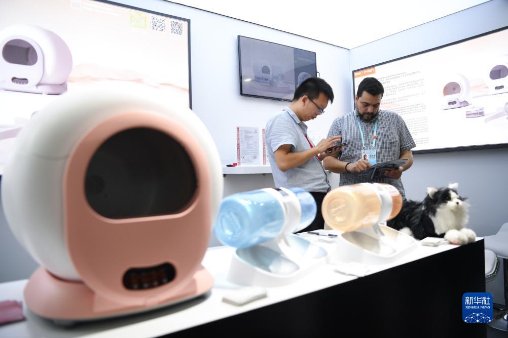 10月15日,在一家智能貓砂盆產(chǎn)品展臺,外國采購商在了解信息。