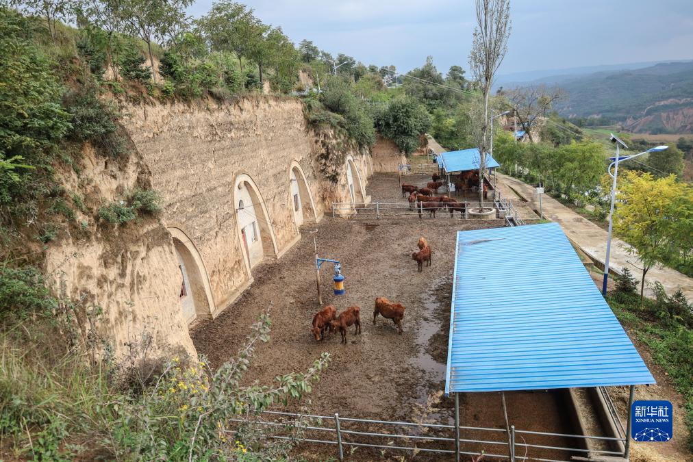 這是10月12日在甘肅省平?jīng)鍪谐缧趴h黃寨鎮甘莊村拍攝的窯洞養牛產(chǎn)業(yè)。