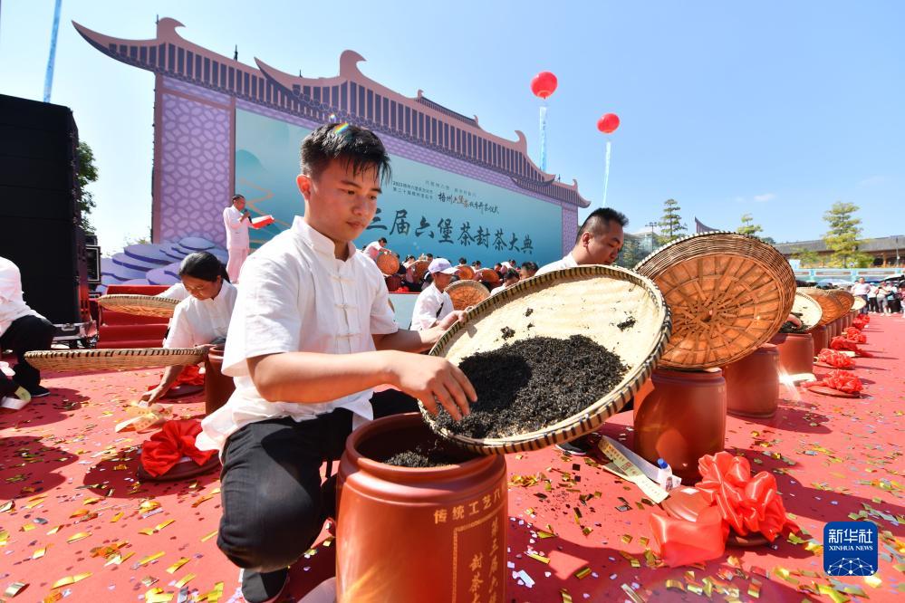 10月15日,在梧州市蒼梧縣六堡鎮六堡茶文化廣場(chǎng),當地制茶人進(jìn)行封茶儀式。