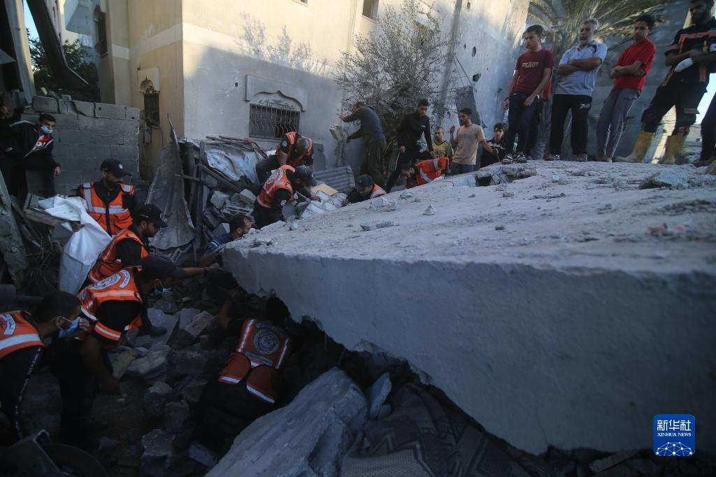 10月15日,在加沙地帶南部城市拉法,救援人員在遭以色列空襲后的受損建筑中實(shí)施救援。
