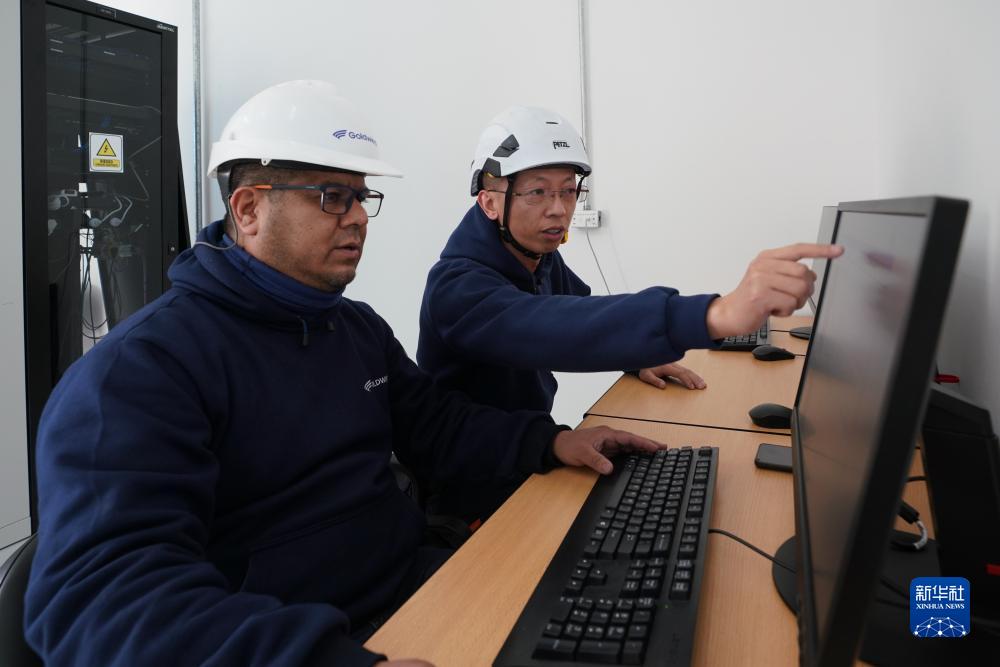 6月12日,在阿根廷丘布特省馬德林港的羅馬布蘭卡一期風(fēng)電場(chǎng),項目工程師馬列(右)與當地工作人員檢查風(fēng)機運行狀況。