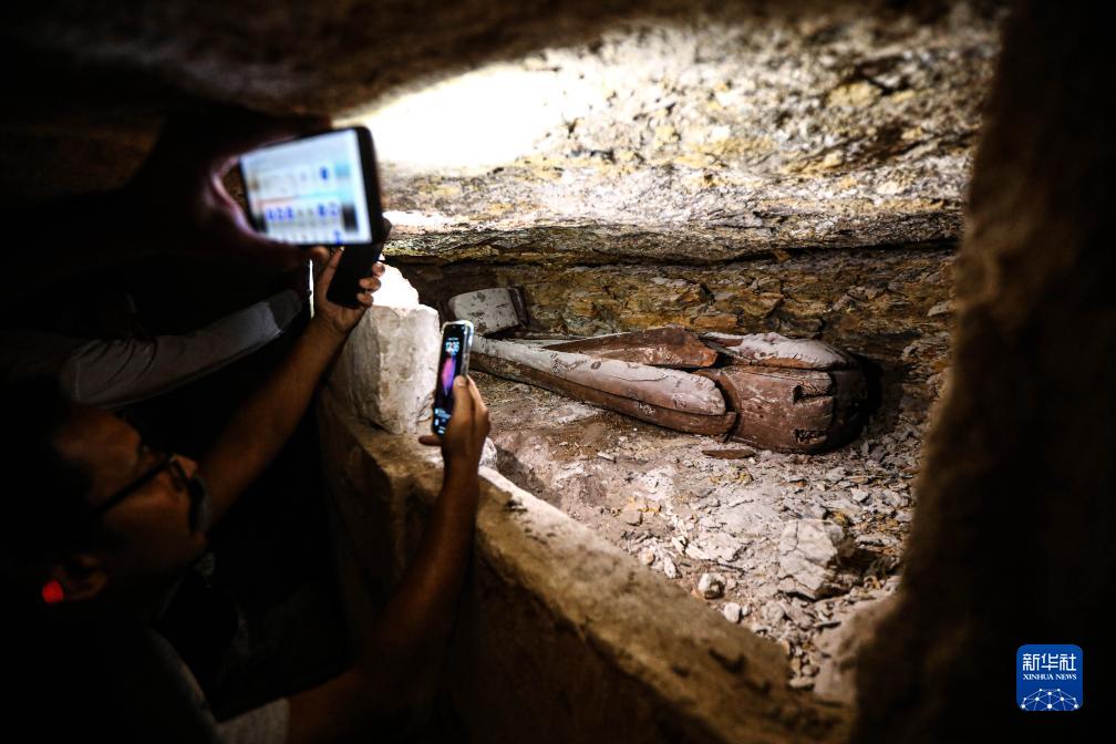 這是10月15日在埃及明亞省考古現場(chǎng)一座石鑿墓中拍攝的木乃伊棺槨。