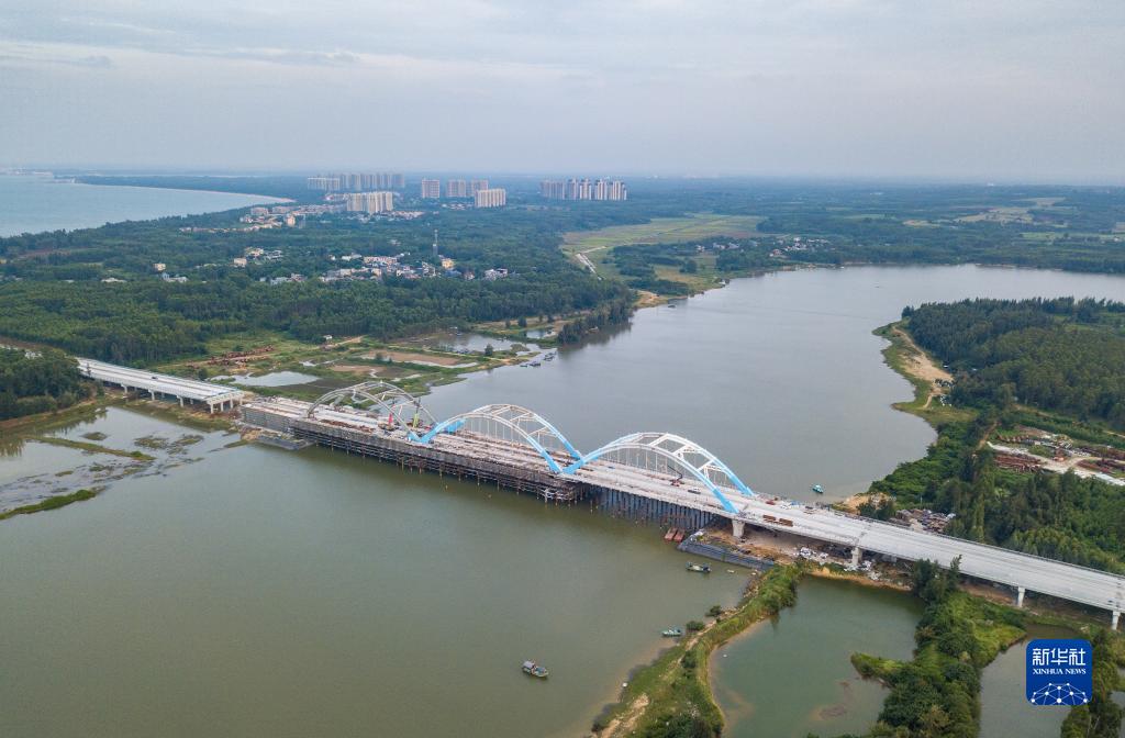 10月14日拍攝的建設中的海南環(huán)島旅游公路臨高段文瀾江大橋(無(wú)人機照片)。