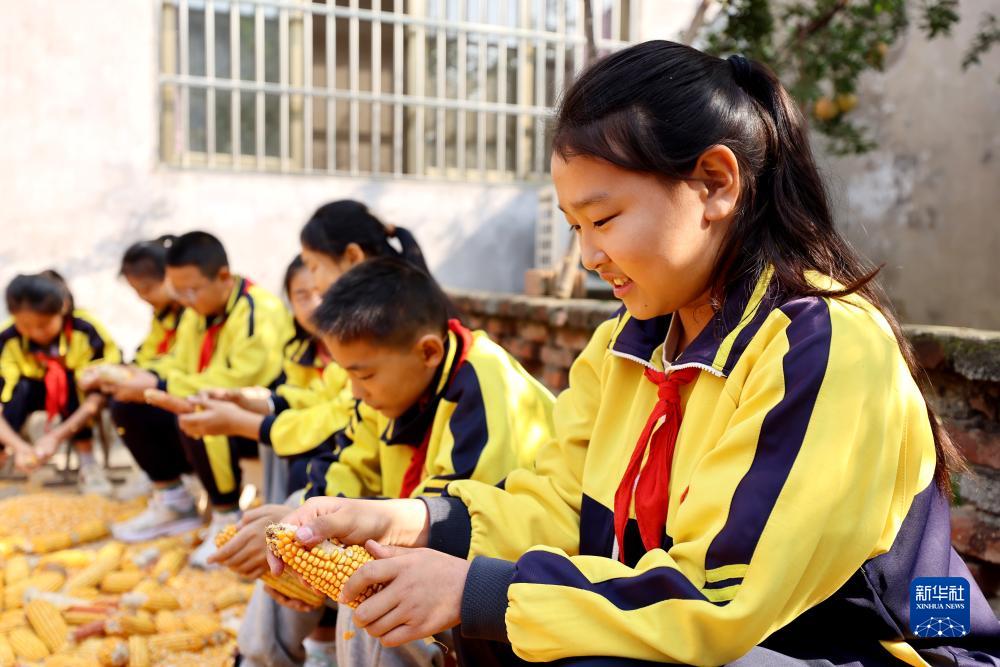 10月16日,山東省棗莊市東山陰小學(xué)學(xué)生在農家小院幫農民搓玉米。