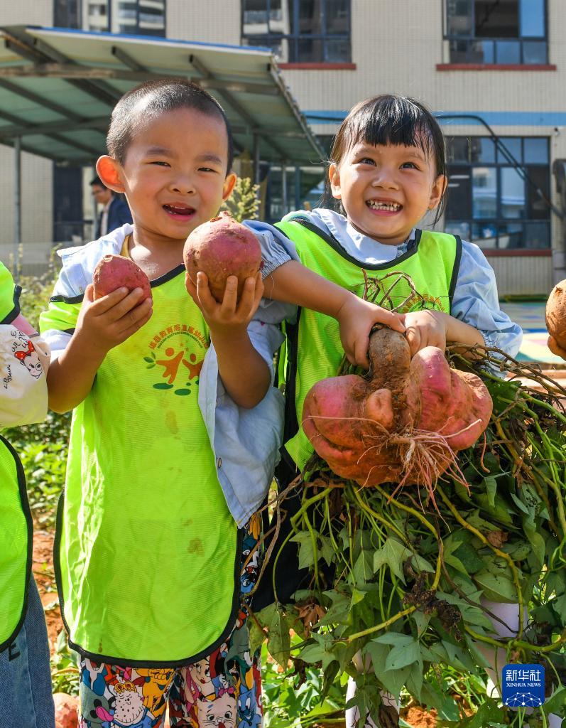 10月16日,湖南省永州市道縣城東幼兒園的小朋友在展示采收的紅薯。