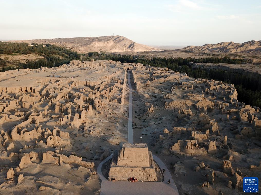8月11日拍攝的夕陽(yáng)下的新疆交河故城(無(wú)人機照片)。