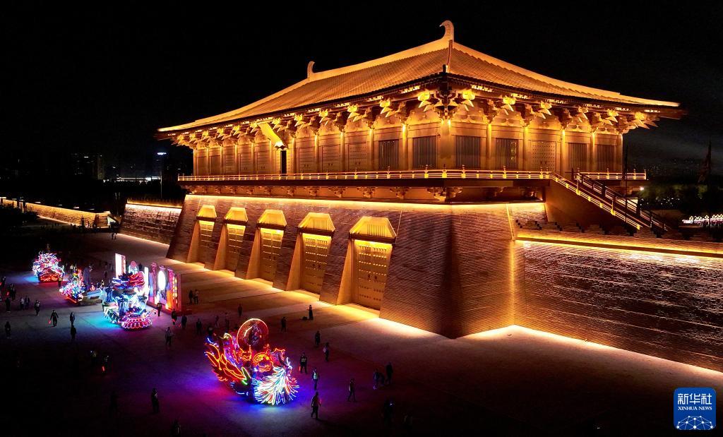 巡游彩車(chē)從西安大明宮國家遺址公園丹鳳門(mén)前駛過(guò)(9月30日攝,無(wú)人機照片)。