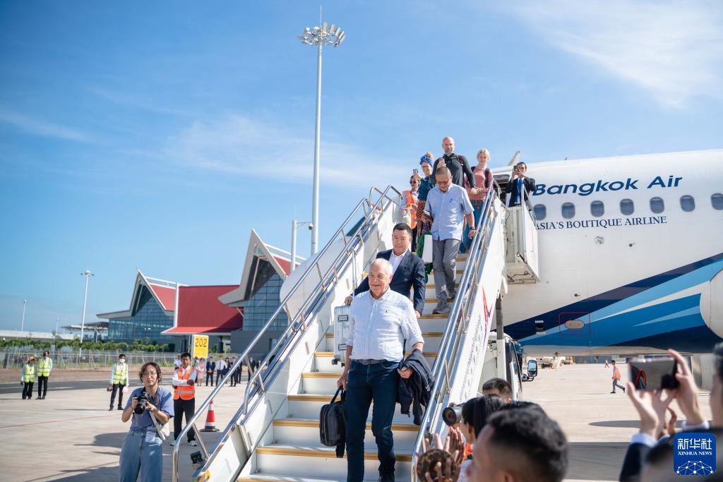 10月16日,在柬埔寨暹粒吳哥國際機場(chǎng),首架進(jìn)港客機乘客走下飛機。