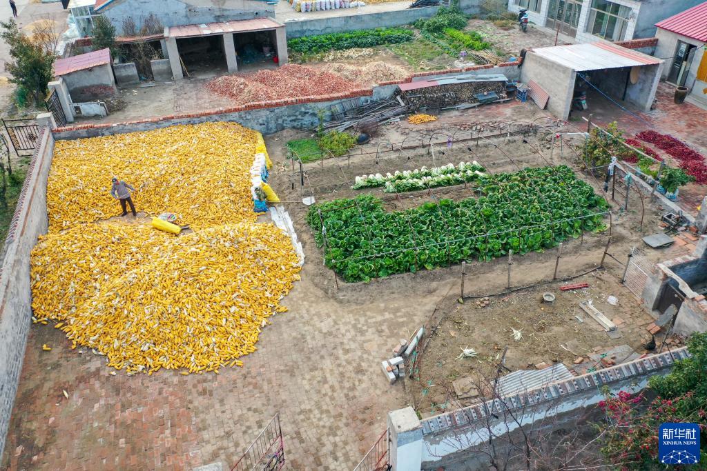 10月13日,通遼市科爾沁區豐田鎮車(chē)力花村村民在家中晾曬玉米(無(wú)人機照片)。