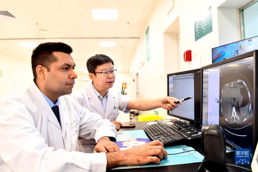 10月16日,在山東大學(xué)齊魯醫院放射科,默罕默德·沙巴茲(左)和博士后合作導師于德新在CT設備前看CT片。