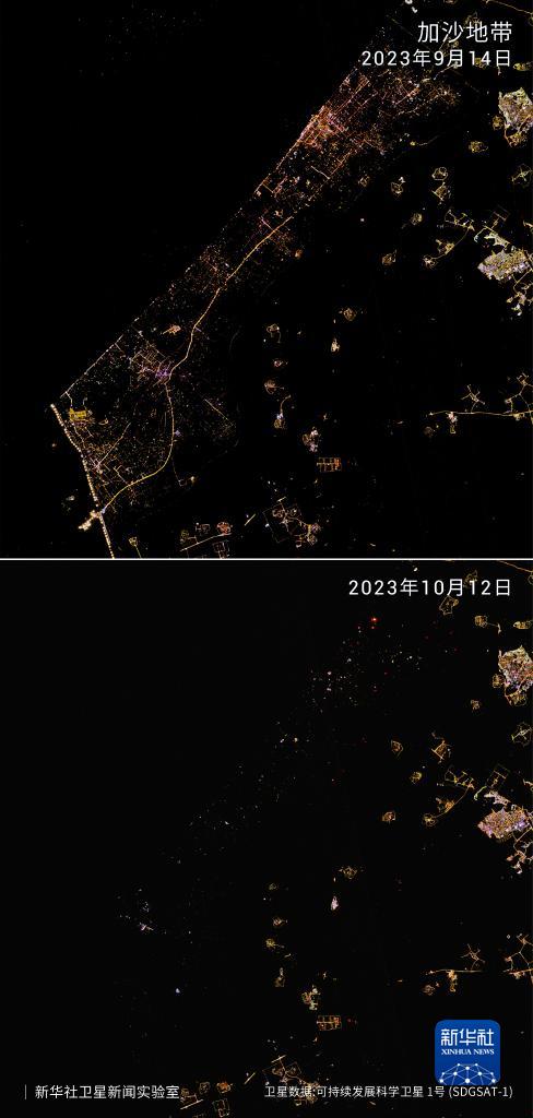這張衛星影像拼圖顯示的是9月14日(上)和10月12日的加沙地帶及周邊地區夜景畫(huà)面。