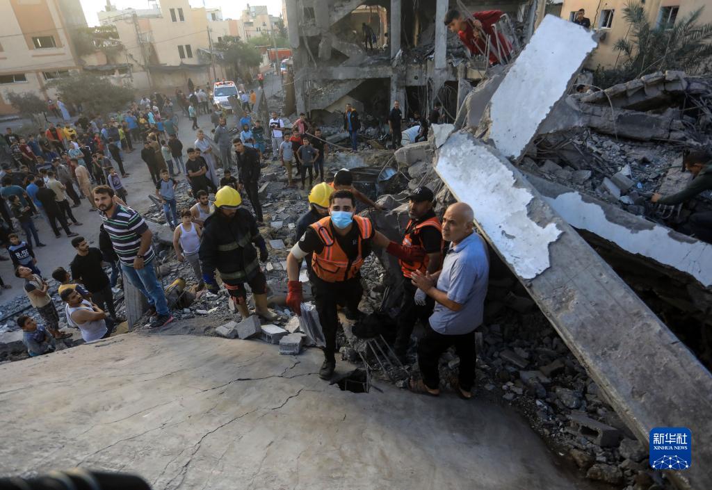10月17日,在加沙地帶南部城市汗尤尼斯,人們在遭以色列襲擊損毀的建筑中實(shí)施救援。