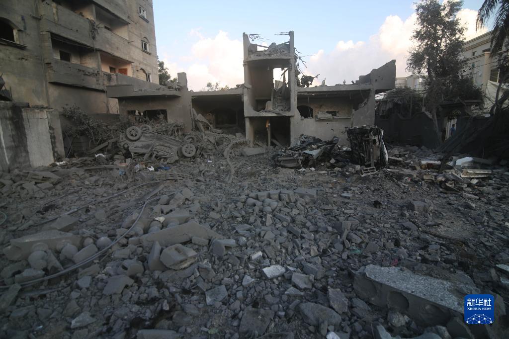 這是10月16日在加沙地帶南部城市拉法拍攝的遭以色列空襲損毀的建筑廢墟。