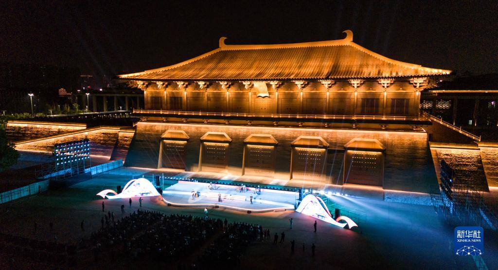 10月16日,在西安大明宮國家遺址公園,來(lái)自塞爾維亞的飛龍和巴爾干城邦樂(lè )團進(jìn)行專(zhuān)場(chǎng)惠民演出(無(wú)人機照片)。