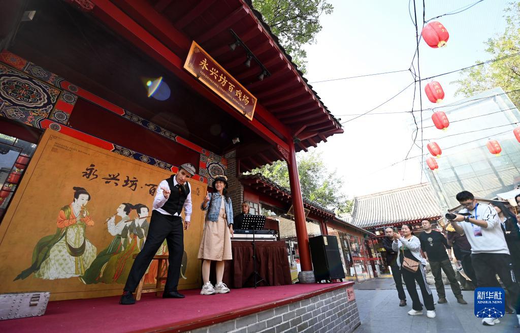 10月16日,來(lái)自斯洛伐克法帝西摩劇院的默劇表演藝術(shù)家弗拉基米爾·庫利塞克(左一)在西安永興坊進(jìn)行惠民巡演時(shí)與觀(guān)眾互動(dòng)。