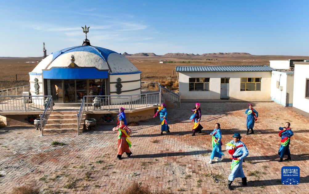 10月16日,樂(lè )隊成員在道爾吉的蒙古包前跳舞(無(wú)人機照片)。