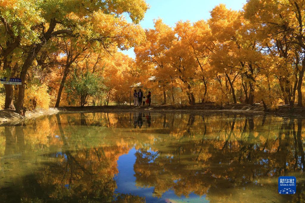 10月17日,游客在甘肅省敦煌市莫高鎮的胡楊林中賞景。