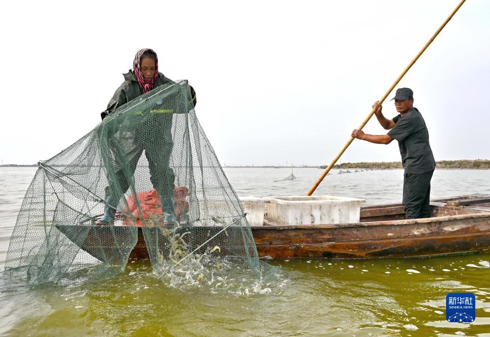 10月17日,在河北省唐山市曹妃甸區,水產(chǎn)養殖戶(hù)在捕撈利用鹽場(chǎng)鹽田鹵水養殖的南美白對蝦。