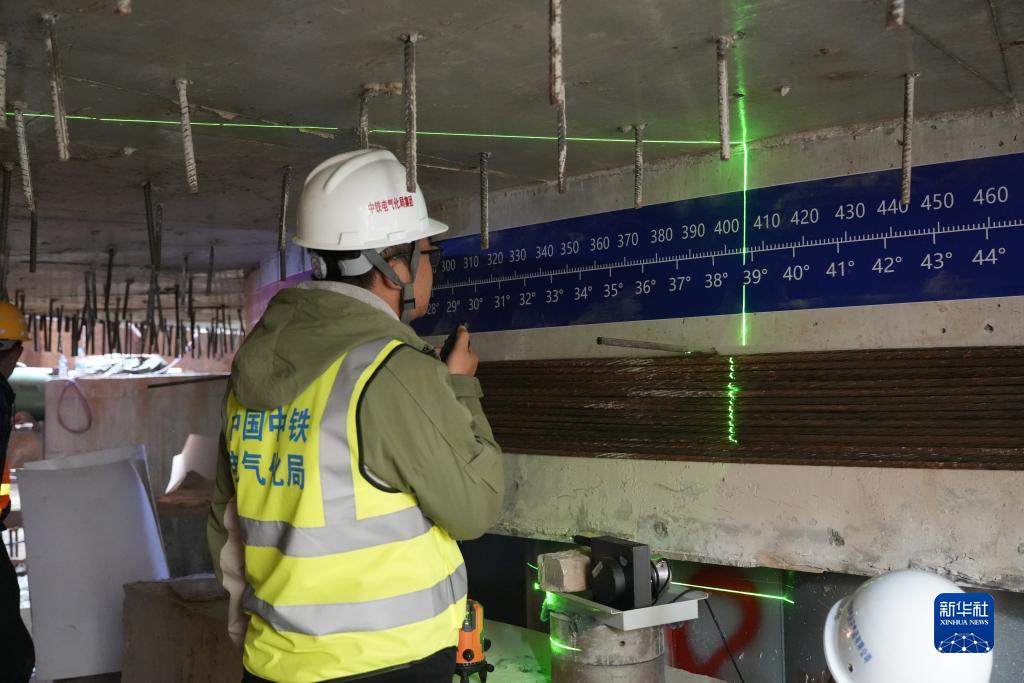 10月18日,施工人員在轉體現場(chǎng)查看轉體橋轉角位移數據。