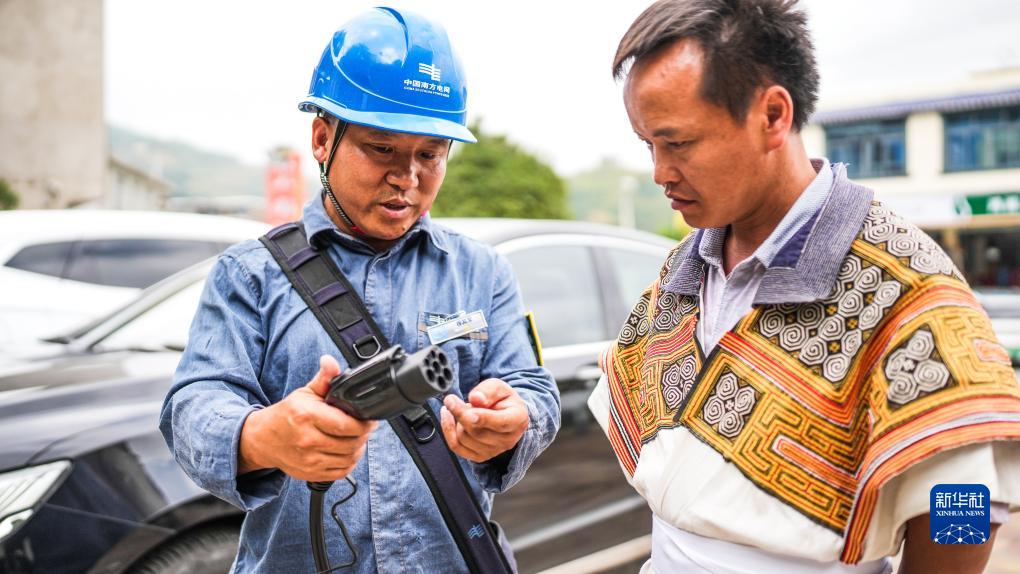在六盤(pán)水市鐘山區青林苗族彝族鄉灰依村,南方電網(wǎng)六盤(pán)水供電局工作人員在指導當地群眾如何正確使用充電樁(9月22日攝)。