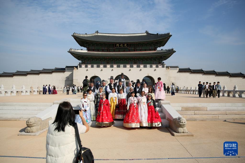 10月18日,游客在韓國首爾光化門(mén)前合影留念。