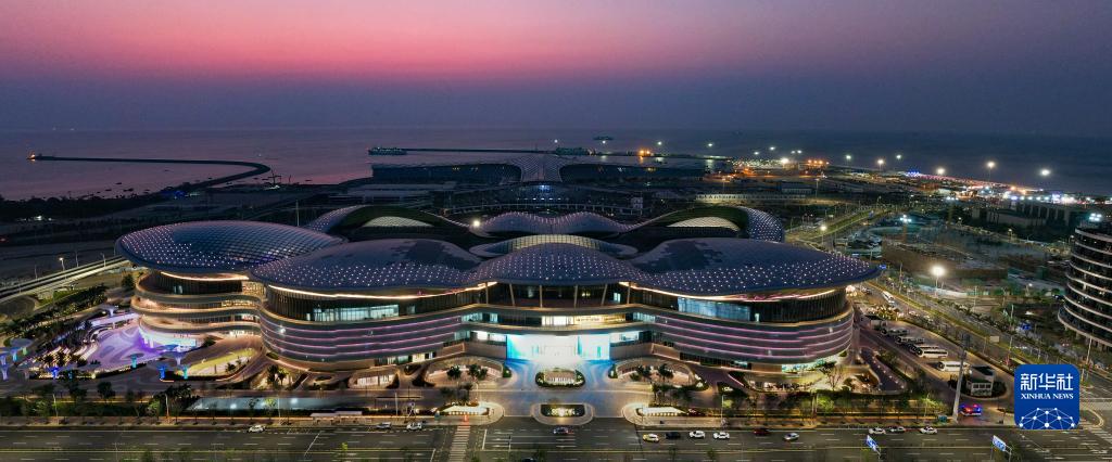 夜色中的??趪H免稅城(前)和??谛潞8劭瓦\綜合樞紐項目(后)(2023年4月4日攝,無(wú)人機照片)。
