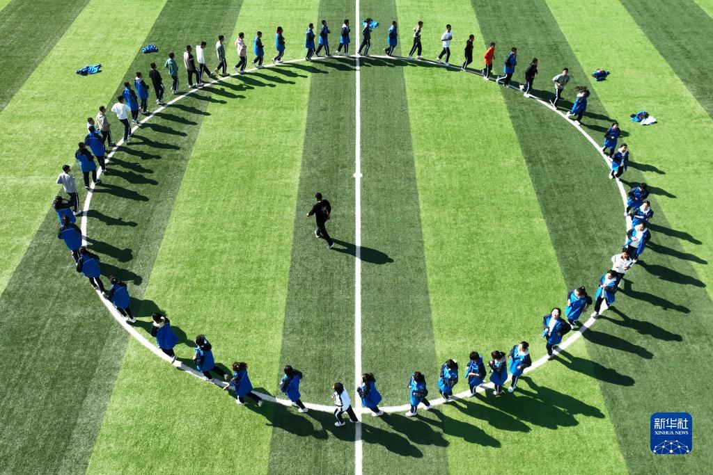 10月16日,蘭州新區高級中學(xué)的學(xué)生在上體育課(無(wú)人機照片)。