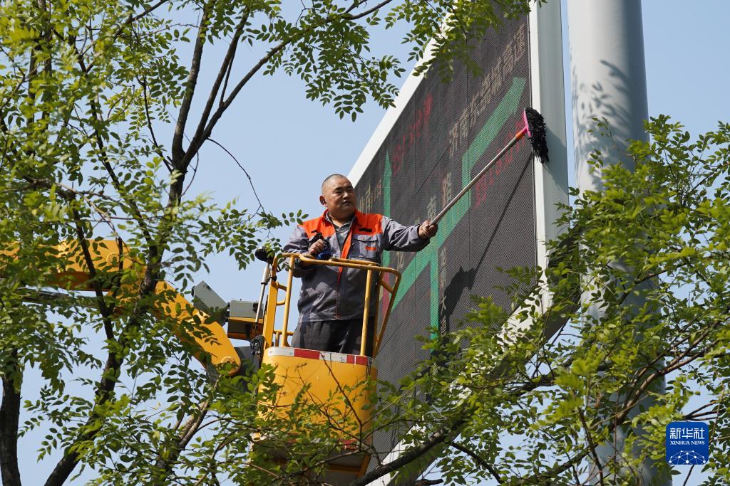 10月17日,保潔人員在清理交通信息牌。