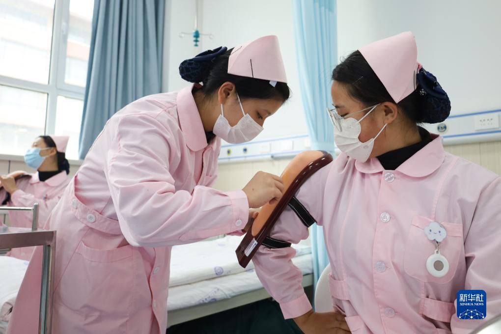 10月17日,在甘肅省蘭州新區科教園區,甘肅省衛生職業(yè)學(xué)院的學(xué)生在基礎護理實(shí)訓室進(jìn)行實(shí)訓課程。