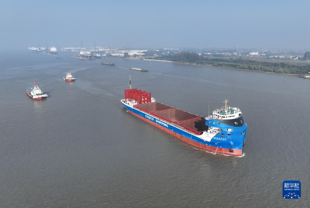 10月18日,中遠海運萬(wàn)噸級電動(dòng)集裝箱船在長(cháng)江試航(無(wú)人機照片)。