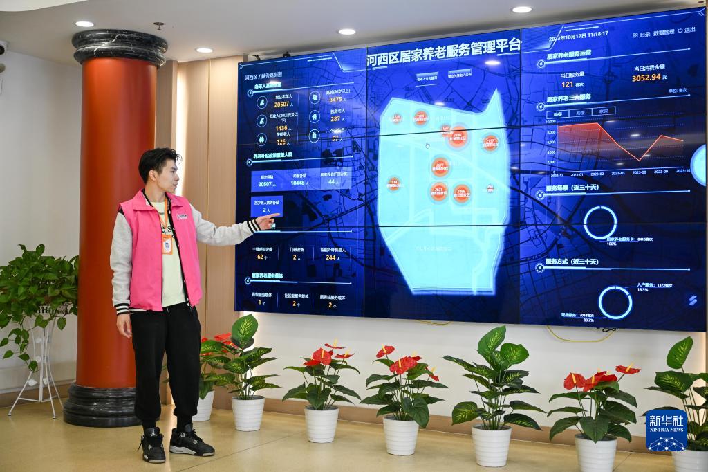 10月17日在天津市河西區越秀路街道居家養老服務(wù)中心內拍攝的河西區智慧養老服務(wù)管理平臺可視化大屏。