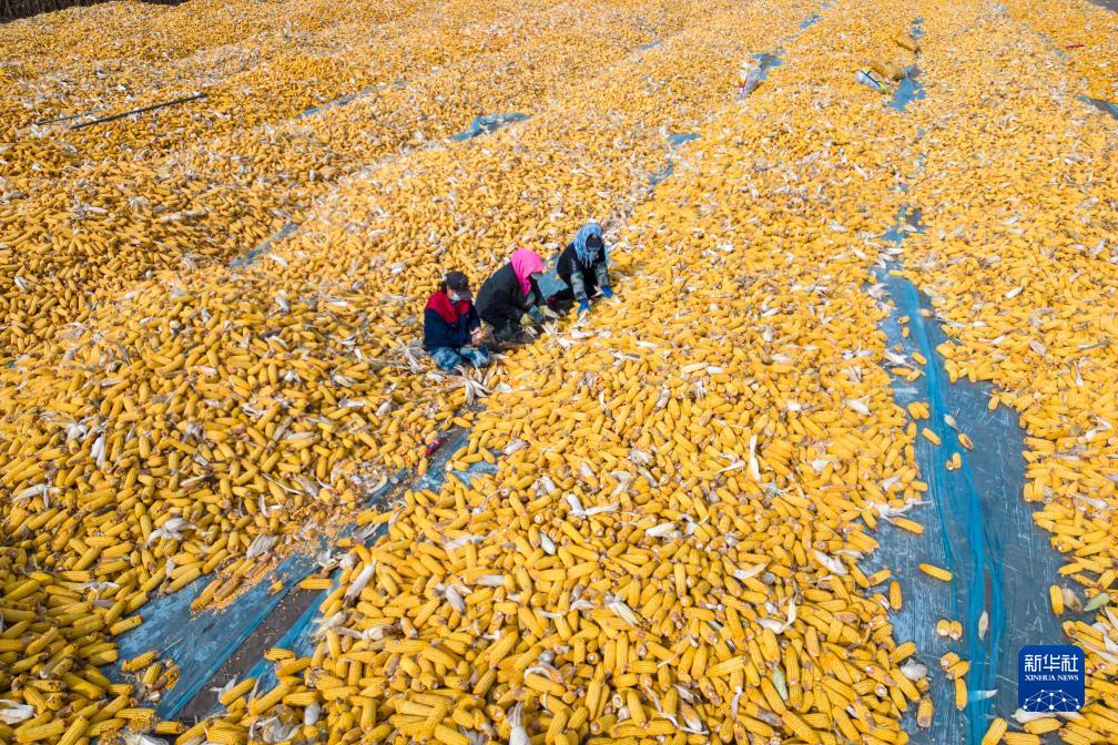 10月18日,村民在綏化市北林區張維鎮潤地農業(yè)種植合作社晾曬場(chǎng)整理玉米(無(wú)人機照片)。