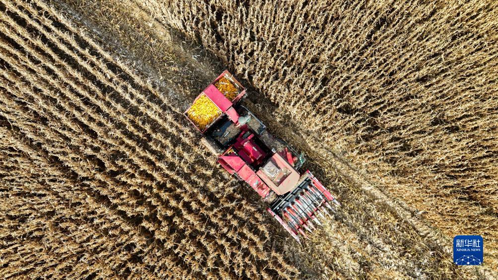 10月18日,在鄂爾多斯市達拉特旗展旦召蘇木柳林村,農民駕駛農機收割玉米(無(wú)人機照片)。