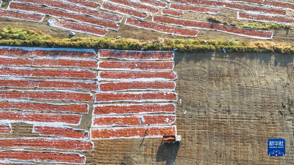 10月18日,農民在河北省遵化市一家果品專(zhuān)業(yè)合作社曬場(chǎng)晾曬山楂干(無(wú)人機照片)。