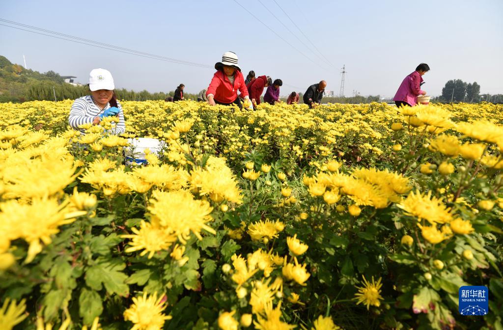 10月17日,河北省石家莊市平山縣北紅岸寨村農民在田里采摘菊花。
