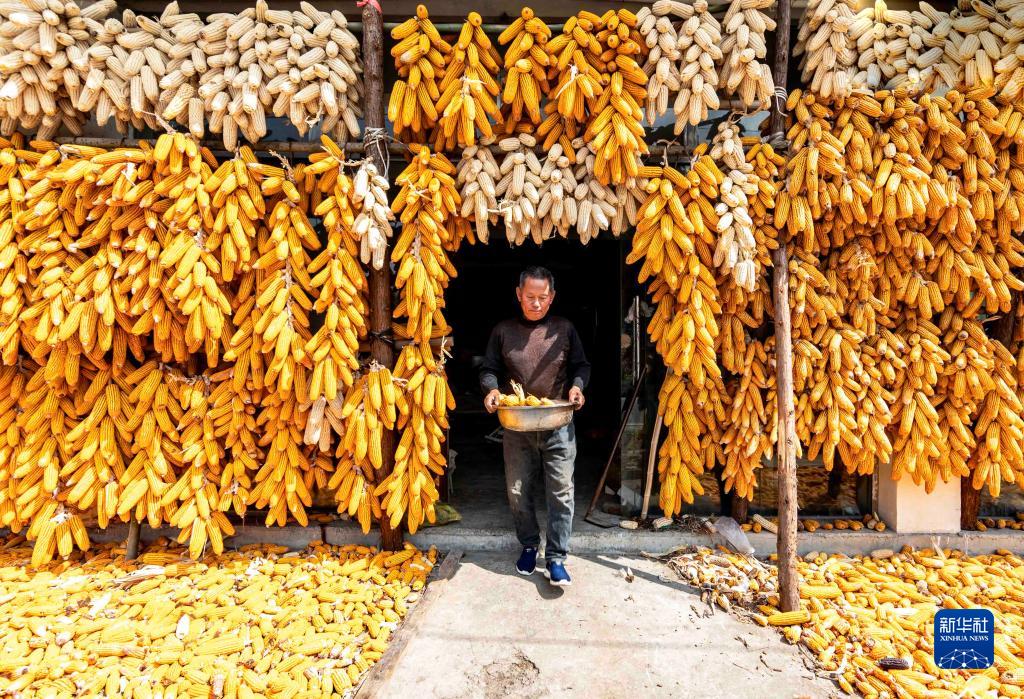 10月18日,貴州省畢節市百里杜鵑管理區普底鄉永豐村農民在屋前晾曬玉米。