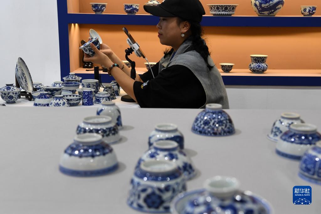 10月18日,一名參展商在瓷博會(huì )現場(chǎng)進(jìn)行網(wǎng)絡(luò )直播銷(xiāo)售。