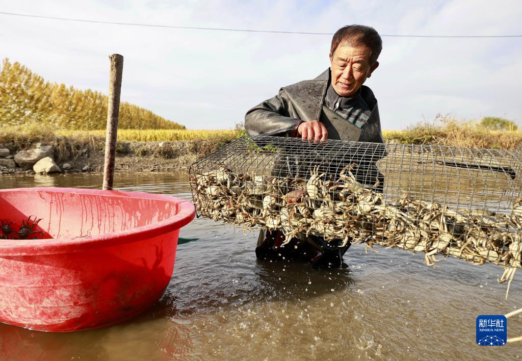 10月18日,唐山市豐南區柳東村的一位農民在捕撈稻田蟹。