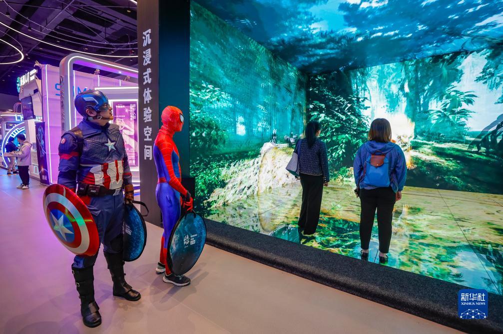 10月18日,在2023成都世界科幻大會(huì )主題展覽上,兩名科幻迷裝扮成科幻電影形象“美國隊長(cháng)”和“蜘蛛俠”(左一、左二),在沉浸式體驗空間觀(guān)看多媒體藝術(shù)作品。