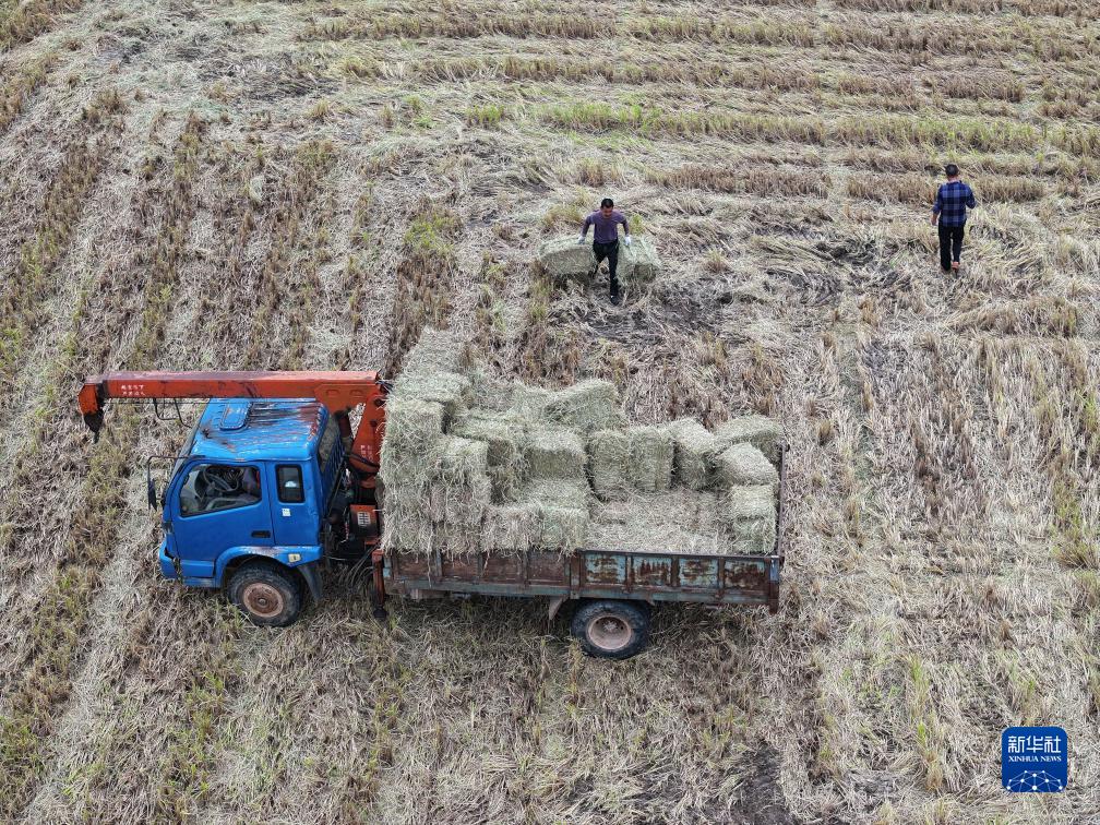 10月19日,在湖南省湘潭市雨湖區鶴嶺鎮晶鑫村,農戶(hù)將已打捆的秸稈搬運上車(chē)(無(wú)人機照片)。
