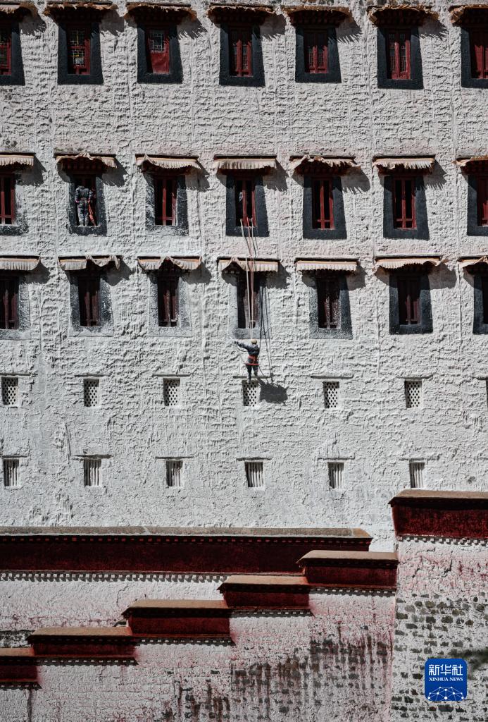工作人員對布達拉宮外墻噴灑涂料(10月18日攝)。