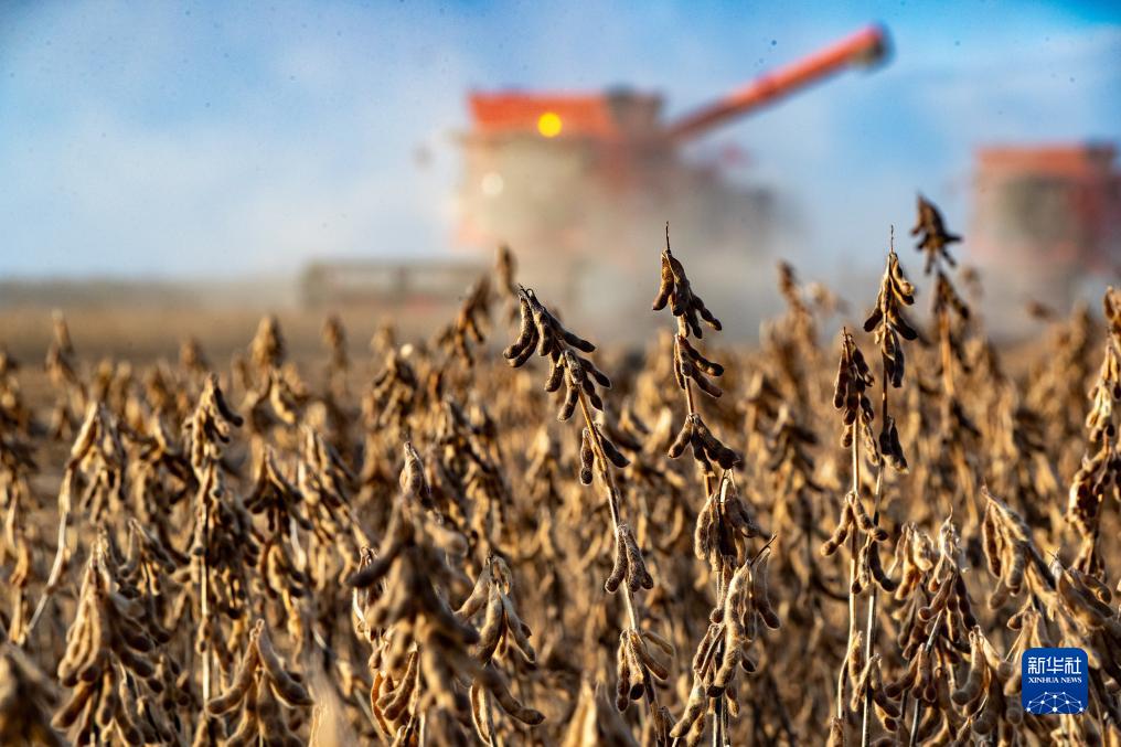 10月19日,收割機在齊齊哈爾市甘南縣中興鄉綠化村的一處大豆地收獲大豆。