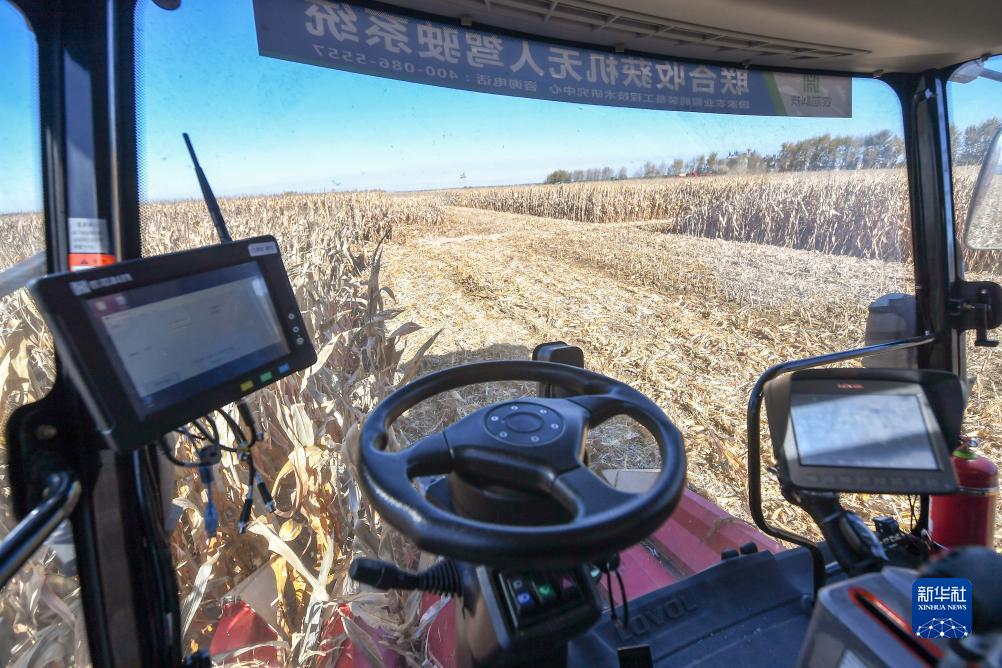 10月19日,在中國科學(xué)院“黑土糧倉”科技會(huì )戰長(cháng)春示范區公主嶺示范基地,無(wú)人駕駛農機在收獲玉米。