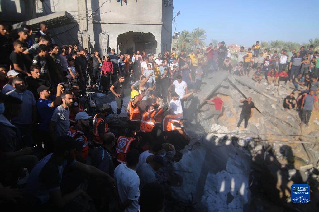 10月20日,人們在加沙地帶南部城市拉法遭以色列襲擊損毀的建筑廢墟上實(shí)施救援。