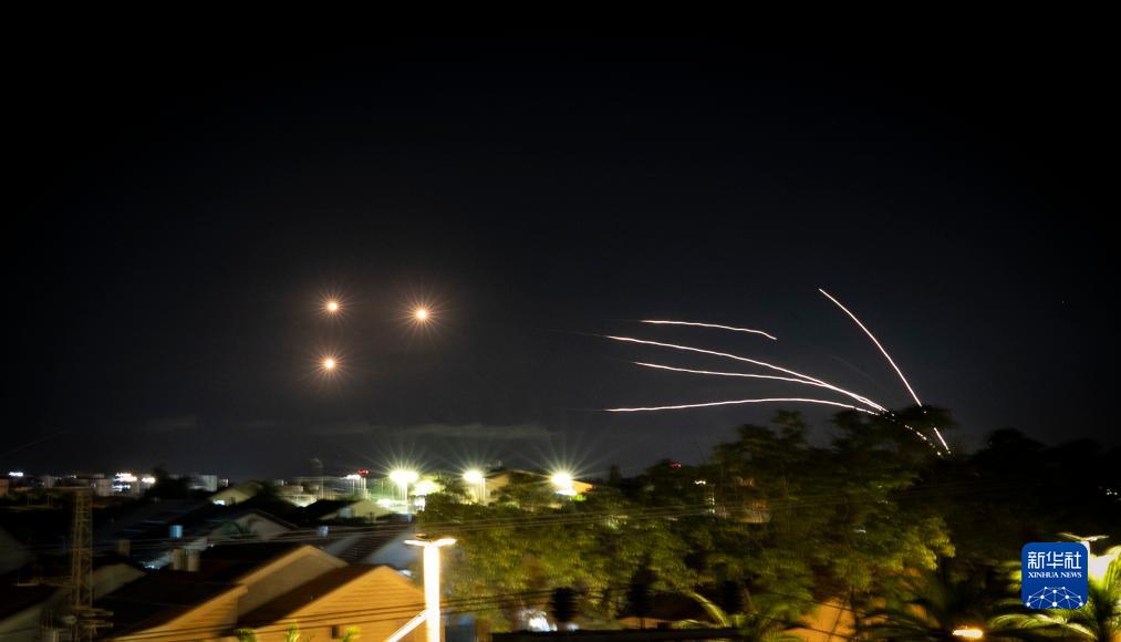 當晚,來(lái)自加沙的火箭彈不斷射向以色列南部邊境城市。以色列“鐵穹”防御系統劃破夜空進(jìn)行攔截。