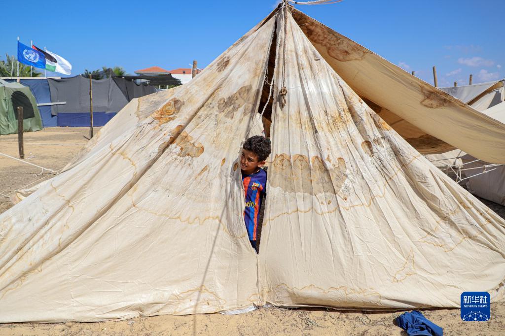 10月19日,在加沙地帶南部城市汗尤尼斯,流離失所的兒童在聯(lián)合國近東巴勒斯坦難民救濟和工程處附屬培訓學(xué)院內的一處帳篷營(yíng)地休息。