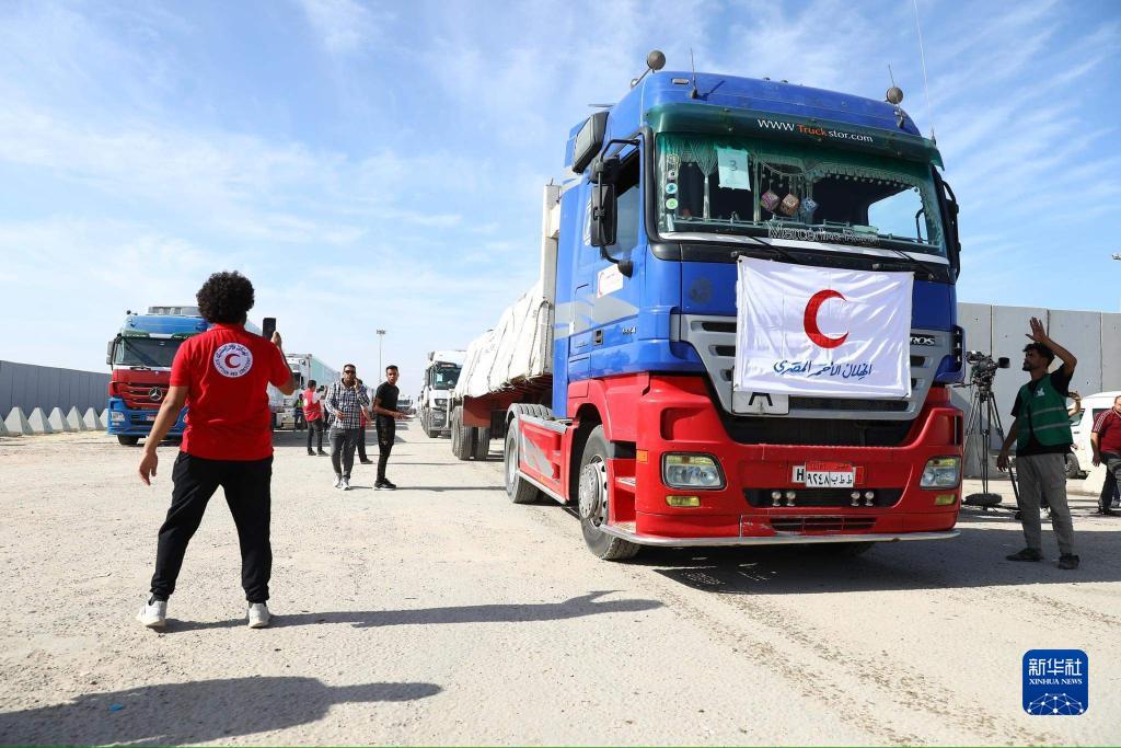 10月21日,在拉法口岸埃及一側,裝載有人道援助物資的貨車(chē)準備通過(guò)拉法口岸。
