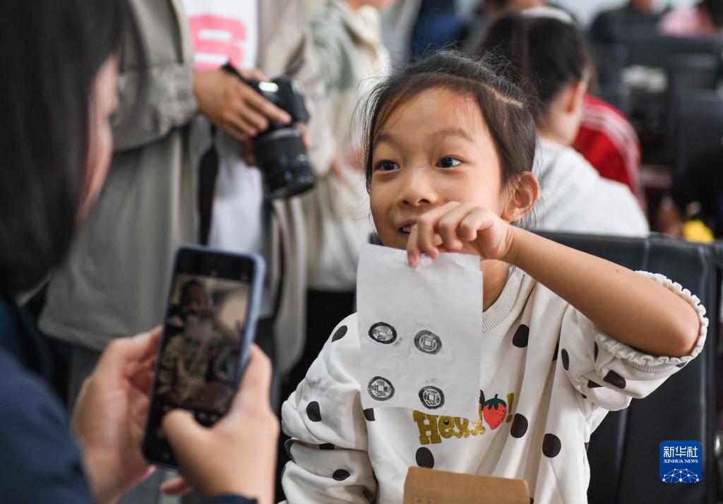 10月21日,一名小朋友向家長(cháng)展示她制作的銅錢(qián)拓片。